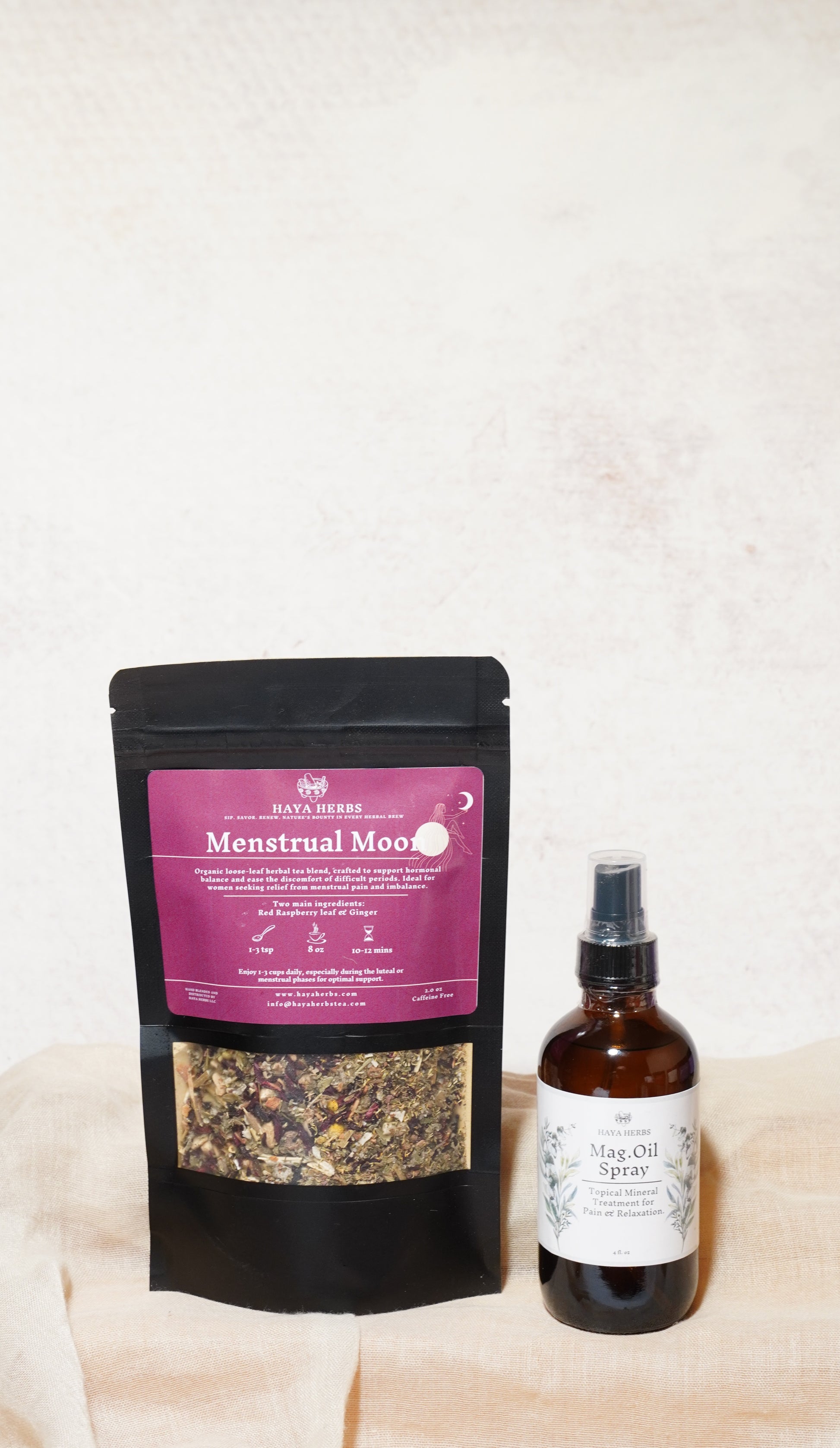 - Want to learn more about each products benefits? Click here: Menstrual Moon Tea & Mag. Oil Spray