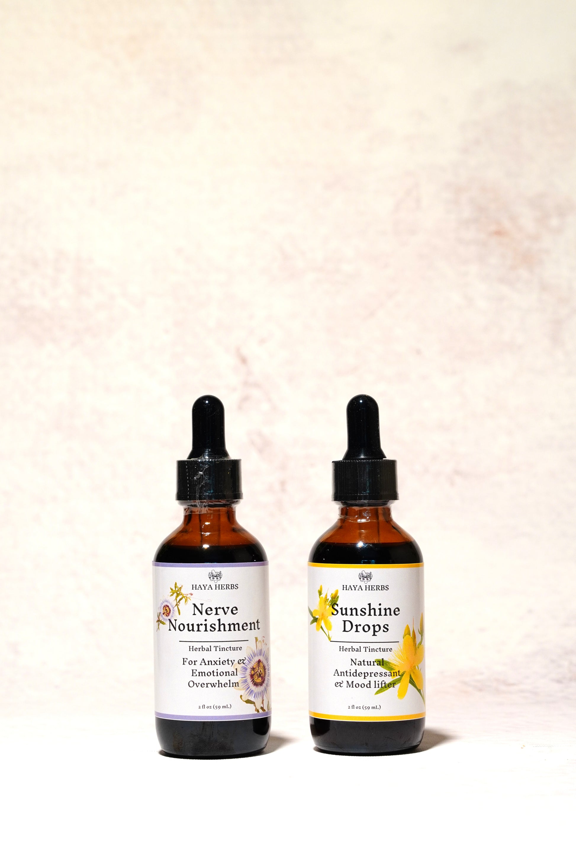 Rise & Rest Duo Option : Tinctures to carry you through your day. Start your morning with Sunshine Drops for energy and uplift, and wind down at night with Nerve Nourishment for calm and relaxation.